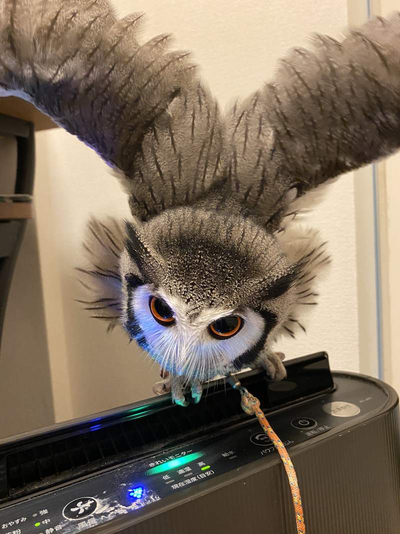 ▼這隻貓頭鷹叫「萌蔥」,牠站在空氣清淨機的出風口,展開雙翅享受風吹來的感覺,看起來就像一個衝浪高手。推主忍不住說:「已經玩了將近10分鐘了。」