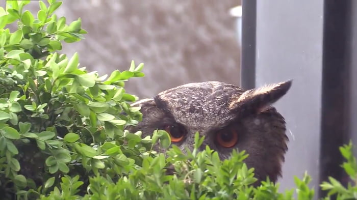 ▼鵰鴞媽媽比較警惕,不會來到窗邊,但牠會在灌木叢後面觀察自己的寶寶。