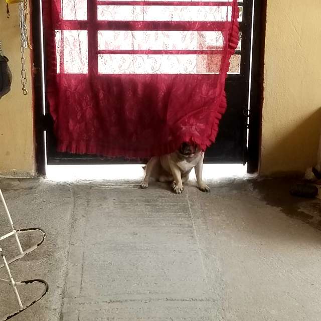 超得意!阿汪躲貓貓藏門簾後 「化身雕像」不動:他們都發現不了我耶~