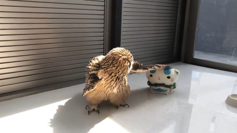 這隻我在罩的!貓頭鷹自認新朋友 瞪眼看主人:還不拿好料招待?