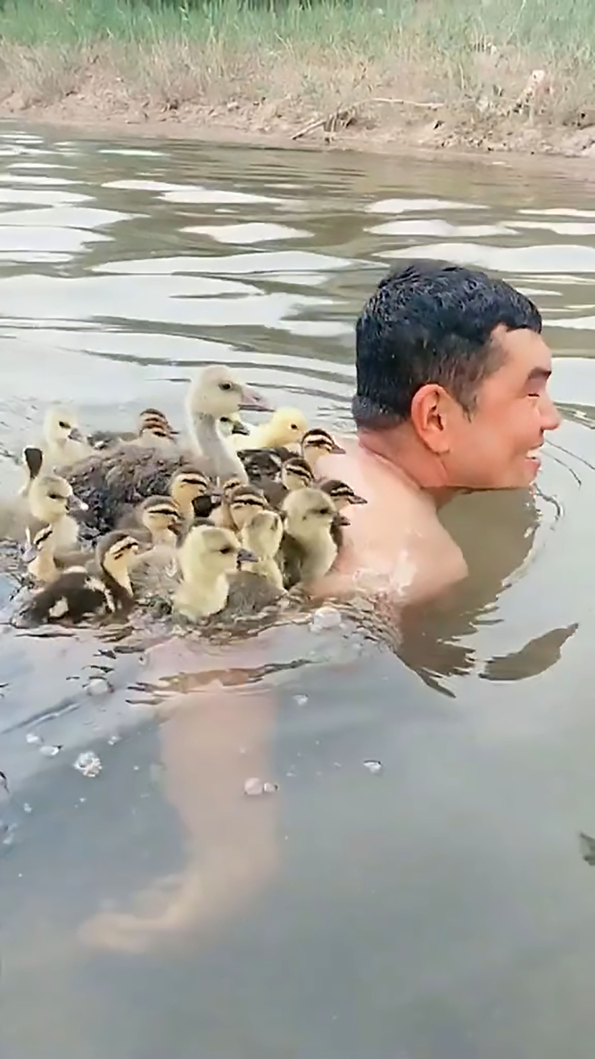 2020年05月29日教小鵝、小鴨游泳本來是牠們的媽媽的責任,但大陸一位網友卻帶著家中的小鵝小鴨們一起下水。小鵝小鴨們有點害怕,竟然爬到主人的背上「搭順風船」,那有趣的一幕特別溫馨,看起來很療癒。