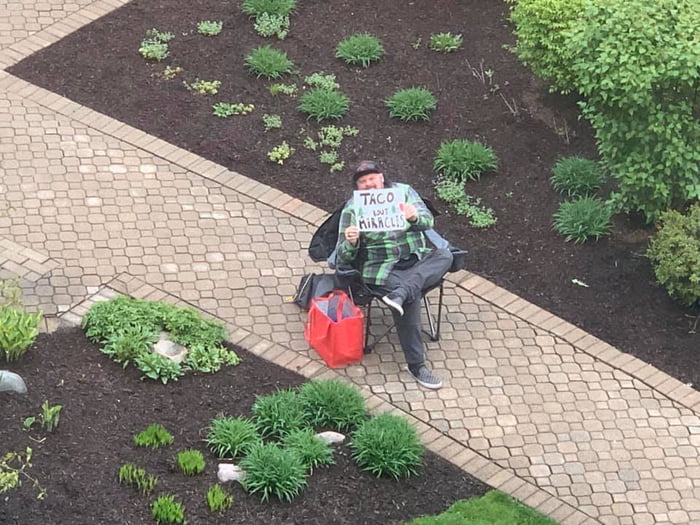 ▼每到約會的時間,Conlin會提前從兩人喜歡的餐廳訂餐,帶著食物、飲料來到醫院,拜託醫護人員交給Moeller。他會在Moeller房間的窗下擺上桌子,舉起標語牌向太太示愛。兩人透過視訊共進晚餐。