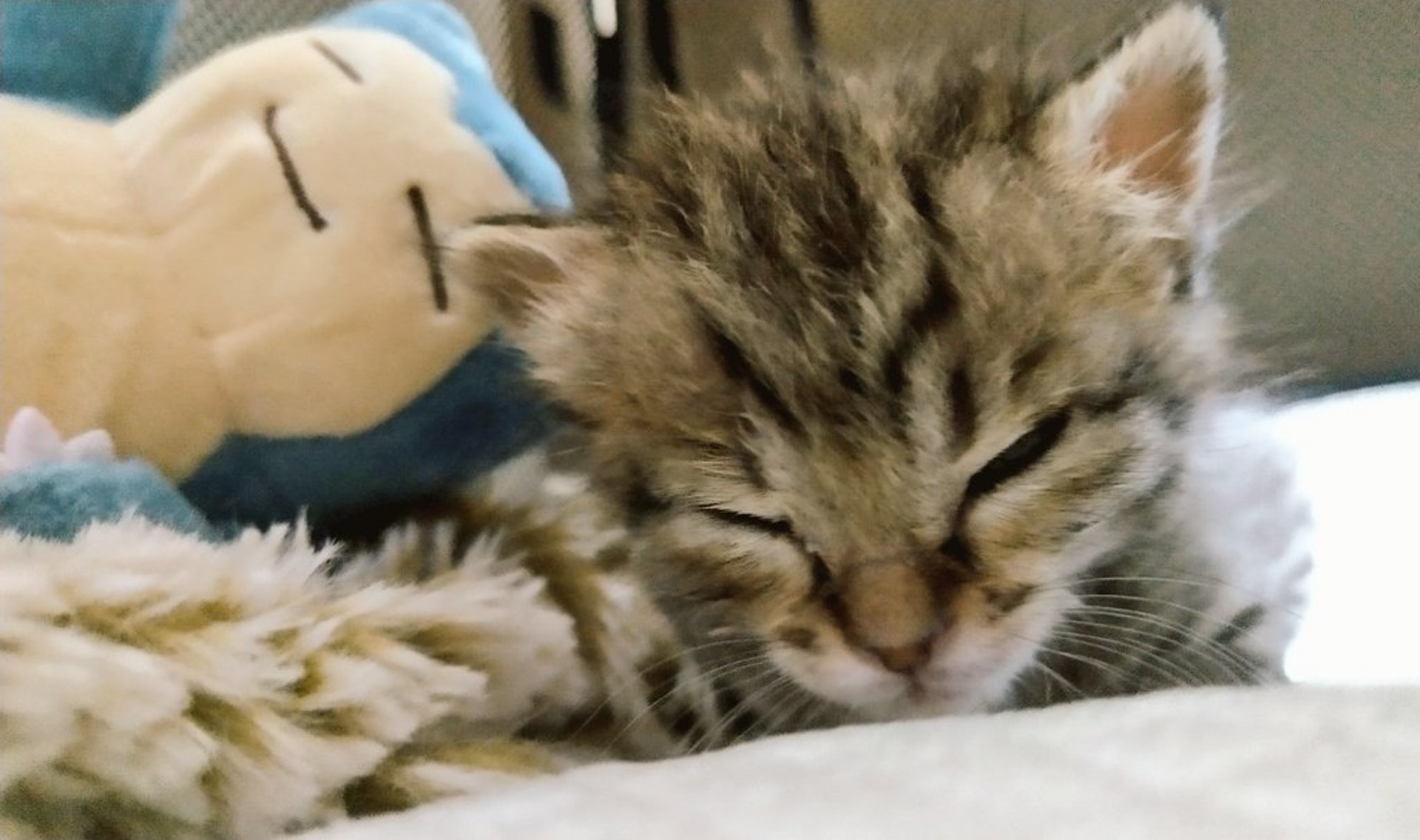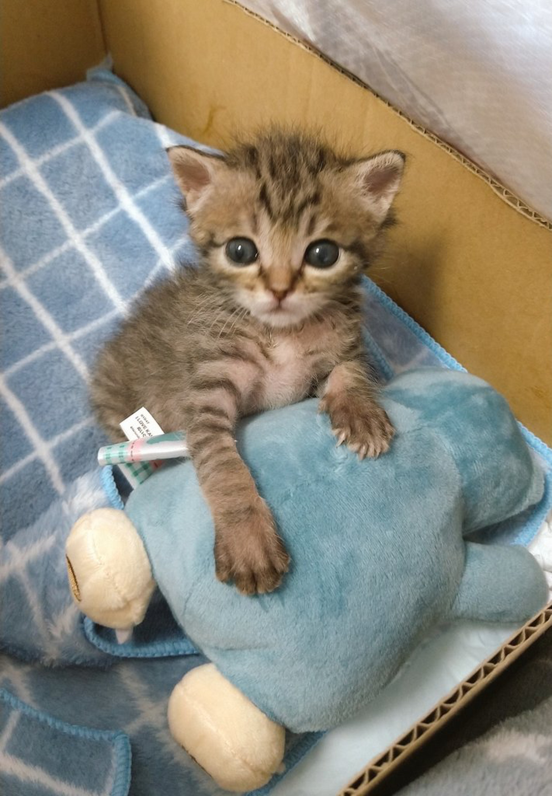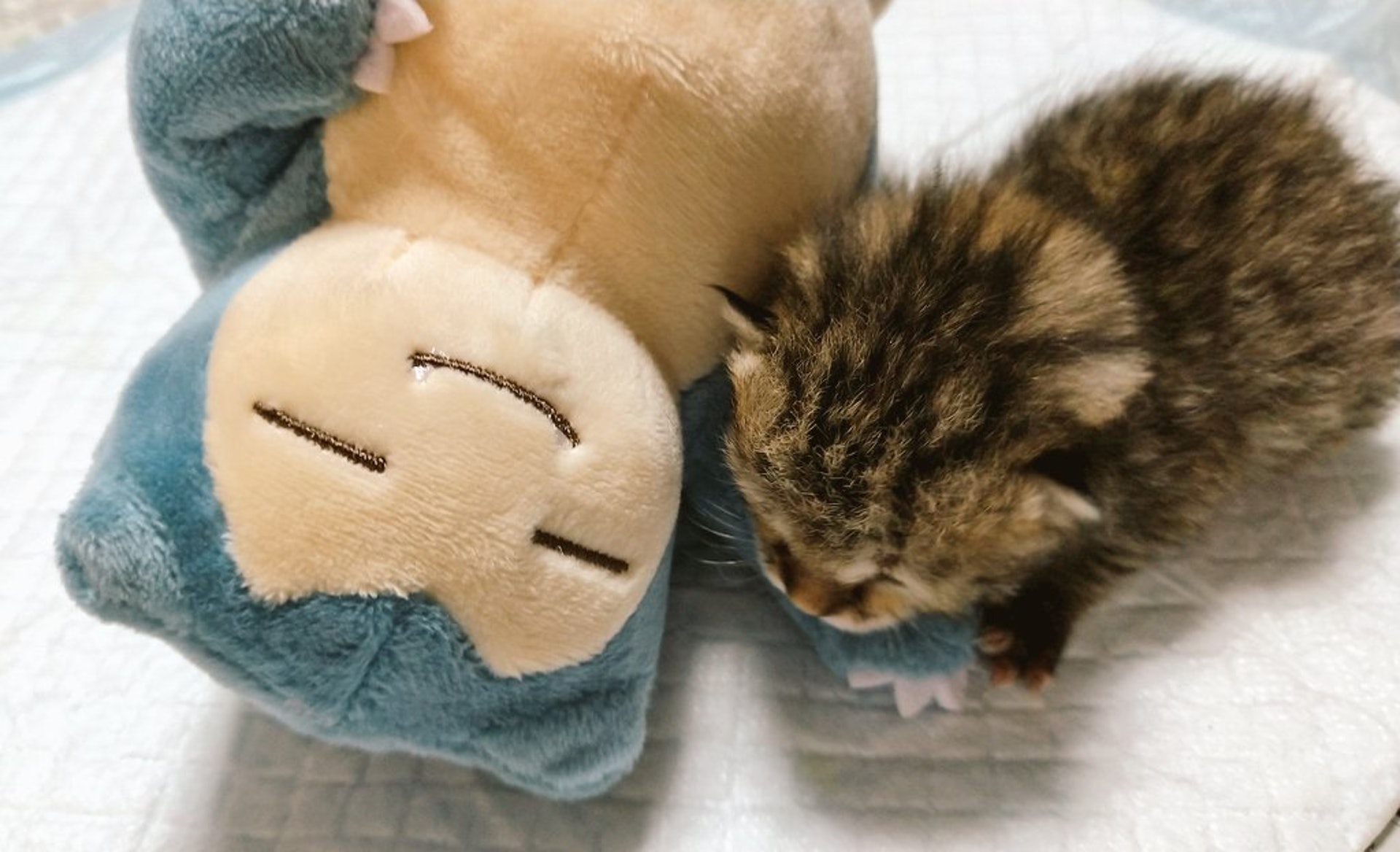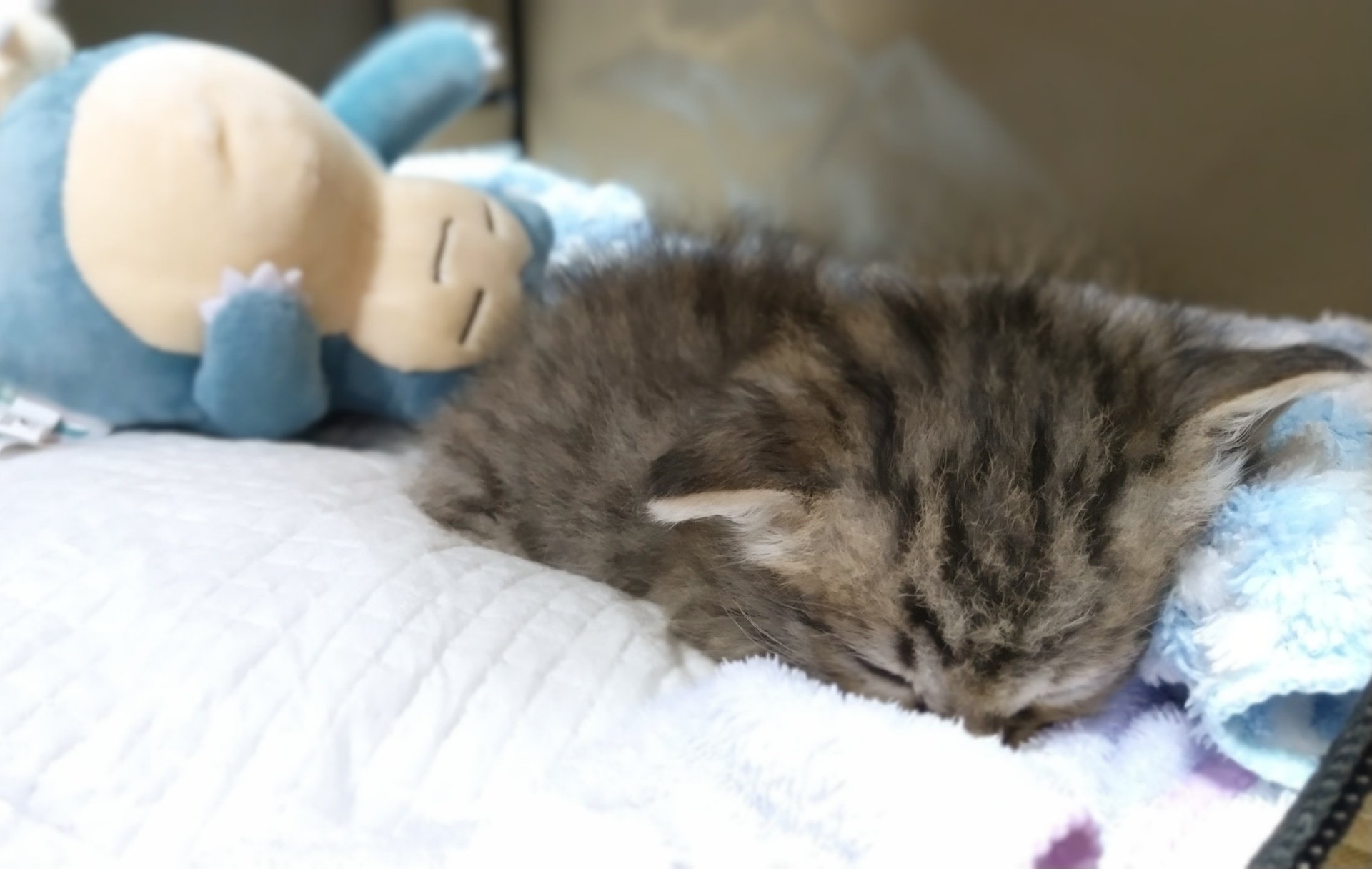 ▼主人將卡比獸玩偶放在貓咪身邊,希望能讓牠覺得安心一點。有卡比獸陪伴,小貓果然鎮靜多了。
