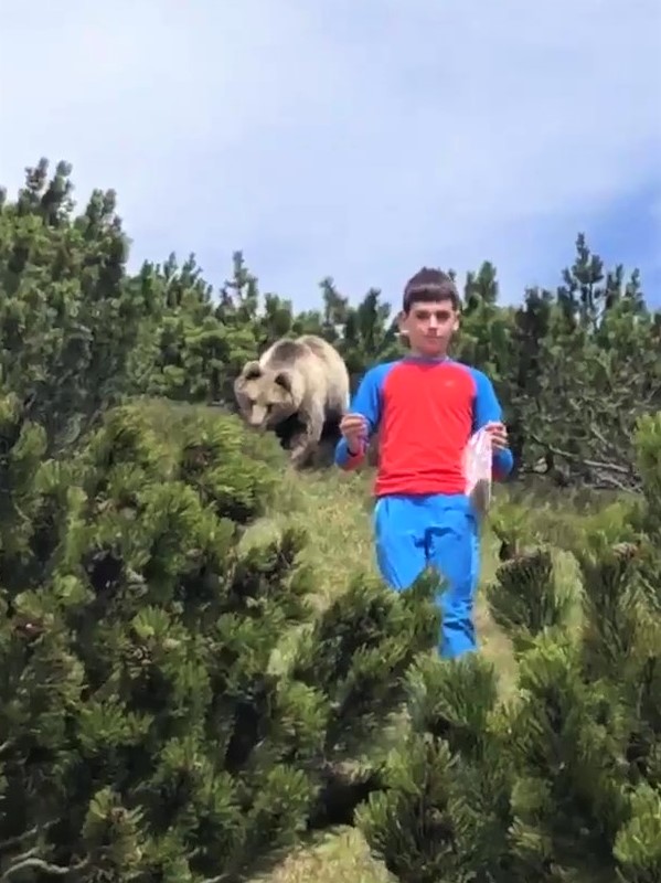 踏青背後冒出一隻熊! 12歲弟「太空漫步式」淡定臉下坡:真的不用理我沒關係…