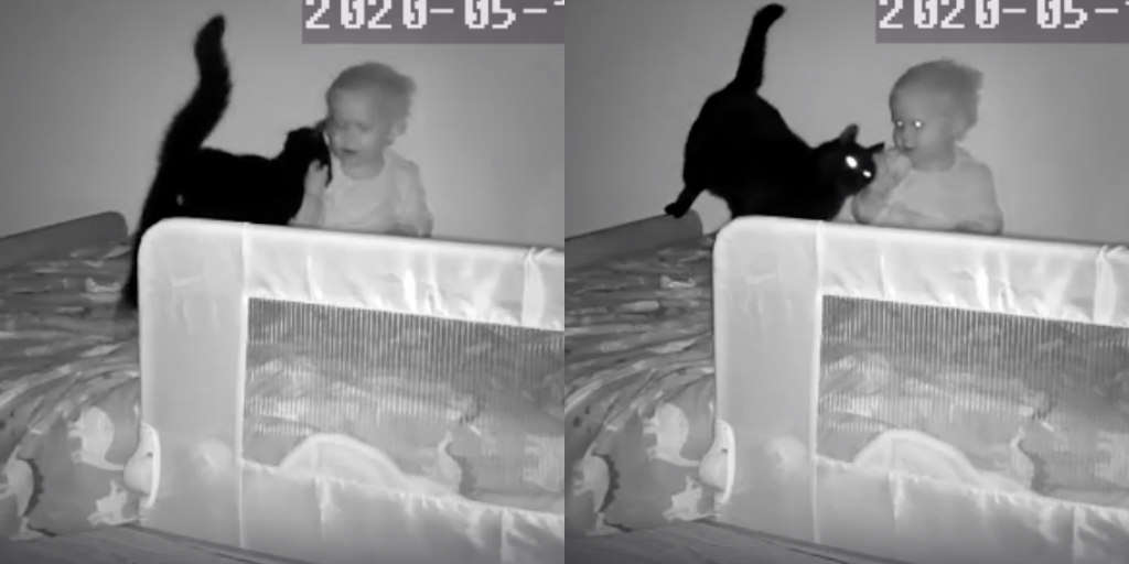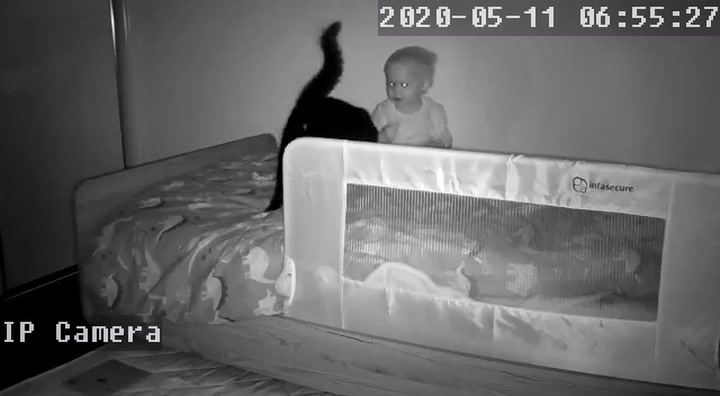 ▼有一天早晨寶寶睡醒後開始吵鬧,Davern去哄孩子之前開啟監視器,這才發現Loki跳到了嬰兒床上。牠似乎準備哄小主人,不停蹭小主人撒嬌。那溫馨的一幕讓Davern很感動。