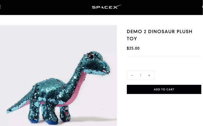 ▼龍飛船2號成功升空後,Space X的網站上架了一款叫「Demo 2 Dinosaur Plush Toy」的龍玩具,價格為25美元,但很快就下架了,不知道是售空了還是Space X有了其他的想法。
