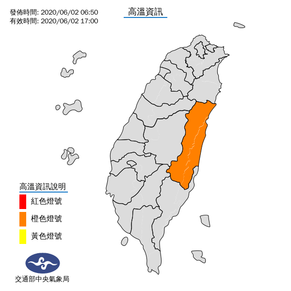 2020年06月02日本週因為滯留鋒面在台灣北部海面到東海面上一代徘徊,台灣位於暖氣團的範圍內,目前的氣象是典型的夏季午後山區熱對流雷陣雨型態,白天悶熱,需要提防高溫、紫外線過量等問題,高溫會來到約35、36度。