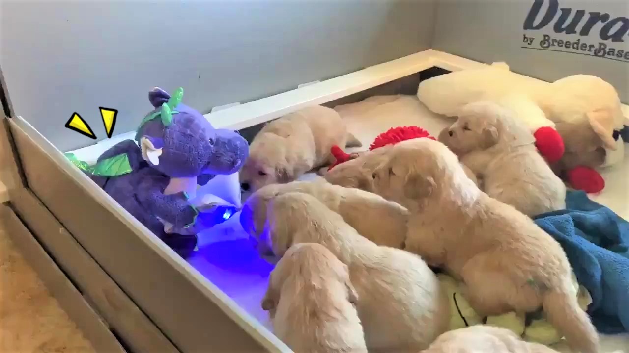 ▼坐在角落的紫色龍玩偶正捧著一本發光的書,嘴巴一開一合、搖頭晃腦地講故事。9隻小奶狗非常捧場,圍繞在它身邊,聽得很認真。
