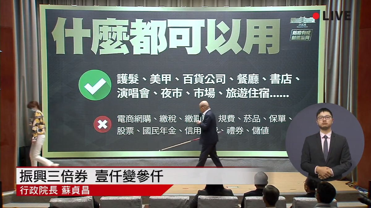 2020年06月02日院長蘇貞昌在6月2日舉行記者會,針對將在7月15日發放的「振興券」的相關措施做更詳細的說明,並將之重新定名為「振興三倍券」。確定將採每人先支付1000元,換取價值3000元的振興券的做法,來達到「提升消費」帶動民生經濟的方針。