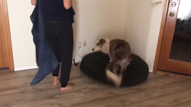 ▼除了Fusion,家裡還有另外2隻狗狗。牠們習慣跟馬麻一起在臥室裡睡,但Fusion會在自己的窩裡就寢。馬麻說:「Fusion看到同伴們跳到我的床上,就會走到自己的狗窩邊,站在那裡等著我、看著我,要我過去幫牠蓋被。」