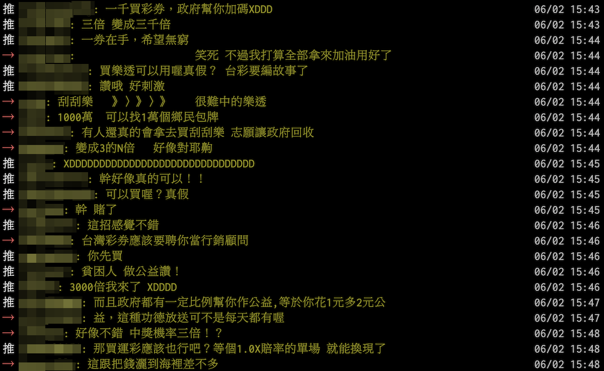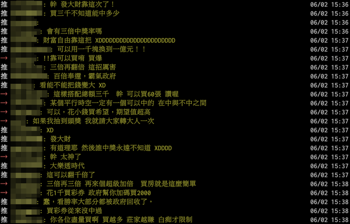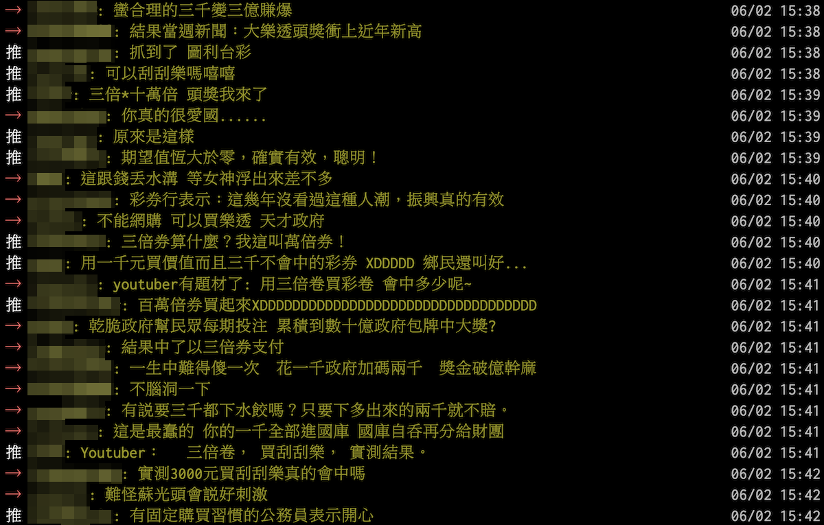 2020年06月03日最近大家對於「振興券」、「三倍券」的議題討論都十分關注,在PTT上就有網友提出「三倍券買樂透最好用」這個主意,獲得眾網友的熱烈回應,大家七嘴八舌討論用三倍券買彩券的效益。