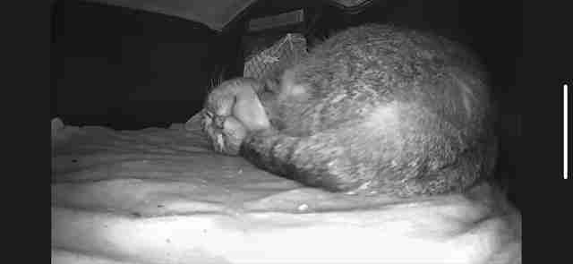 ▼之後Mama又生了第二胎,因為擔心貓咪們的狀況,卡桑諾之後又在貓屋裡架設起監視攝影機,來確保貓咪的安全,還因此照到了貓咪超萌的睡姿照,牠臉上看起來很像正在微笑,滿足的睡臉融化了網友。