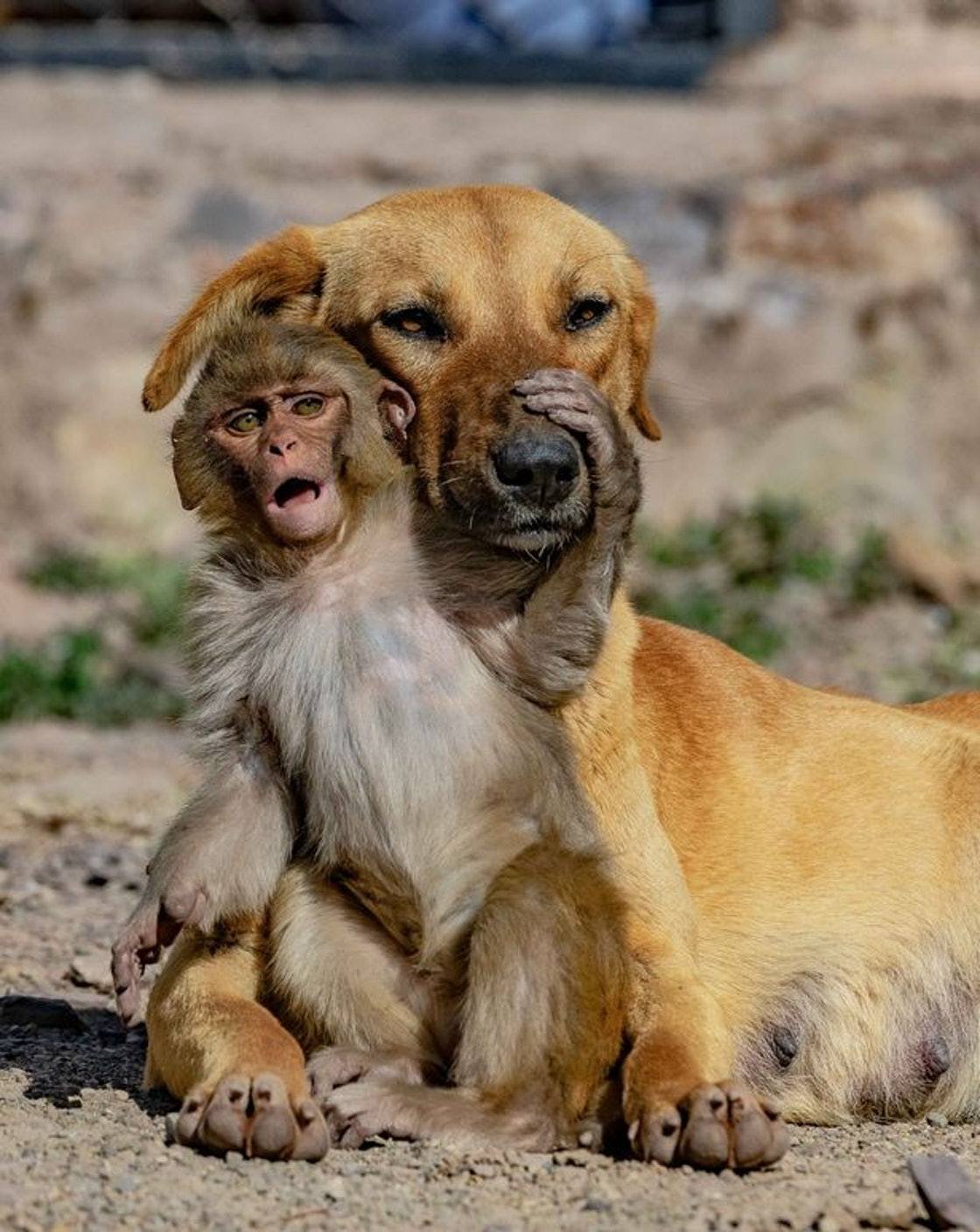 2020年06月06日印度一位攝影師Prakash Badal在印度北部的喜馬偕爾邦(Himachal Pradesh)小村莊裡用相機捕捉到一系列溫馨的動物相片,照片中是一隻懷孕的汪星人和一隻小猴子,原來小猴子才剛出生10多天就舉目無親,幸好狗狗的母親本能讓牠把小猴子當成自己的孩子來養育。