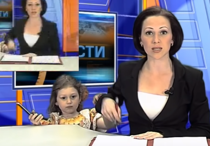 ▼這位女主播叫Anna Kizilova,在俄羅斯塔吉爾電視台(TaglTV)工作。2012年時,她一臉嚴肅播報新聞期間,女兒Elizaveta竟突然闖入鏡頭中。只見Elizaveta一手拿著手機,用另一手點了點媽媽的手臂。