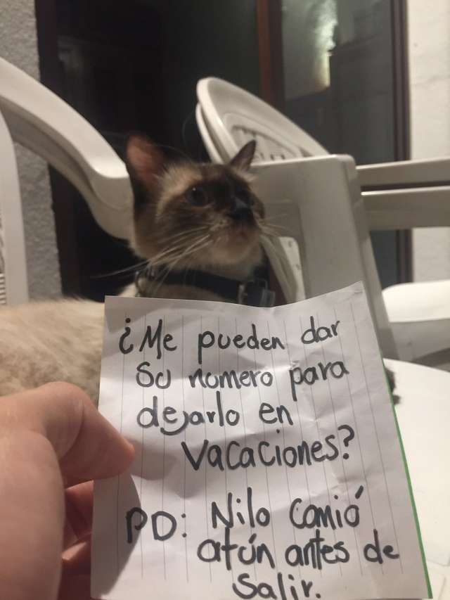 ▼Nilo又準備出門時,Morales特別寫了一張紙條:「可以要一下您的聯絡方式嗎?還有,Nilo出門前已經吃過魚了。」他希望跟另一個家庭保持聯絡,時刻掌握貓咪的蹤跡。不管Nilo多「渣」,還是他的愛寵啊!