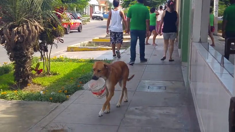 ▼當時天氣很熱,祕魯非常乾旱,當地河流、渠道等都乾涸了,在外討生活的動物們幾乎找不到自然的水源。這隻浪浪不知道從哪裡找來一個小水桶,竟然叼著它到處討水喝。