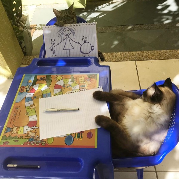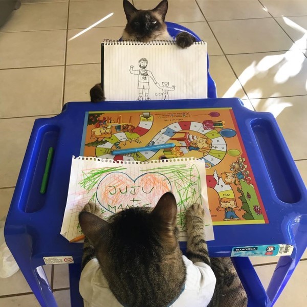 2020年06月13日這兩個學生太乖啦~國外一個家庭養了3只貓咪,其中虎斑貓Jurandir和喜馬拉雅貓Douglas感情最好,經常一起玩。最近小主人Clarinha想玩扮家家酒,她扮演老師,讓這兩隻貓咪扮演學生。Clarinha給貓咪學生上畫畫課,兩隻貓咪竟然聽得很認真!