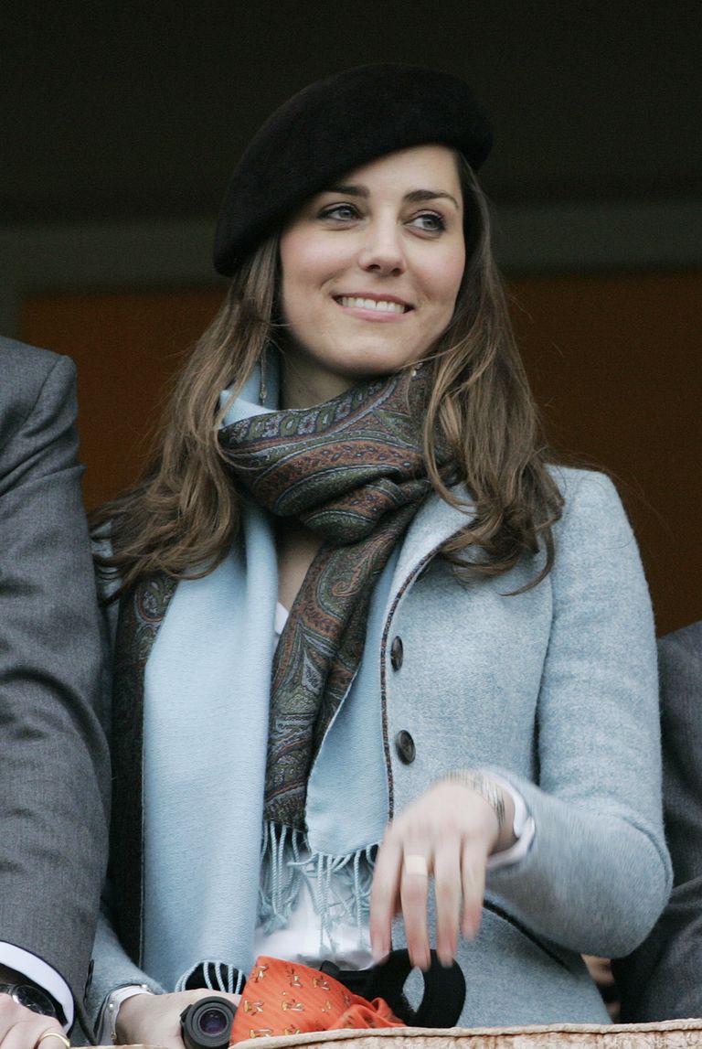 ▼2007年3月16日,凱特在英格蘭格洛斯特郡切爾滕納姆節的最後一天,戴著黑色貝雷帽和佩斯利花紋圍巾。