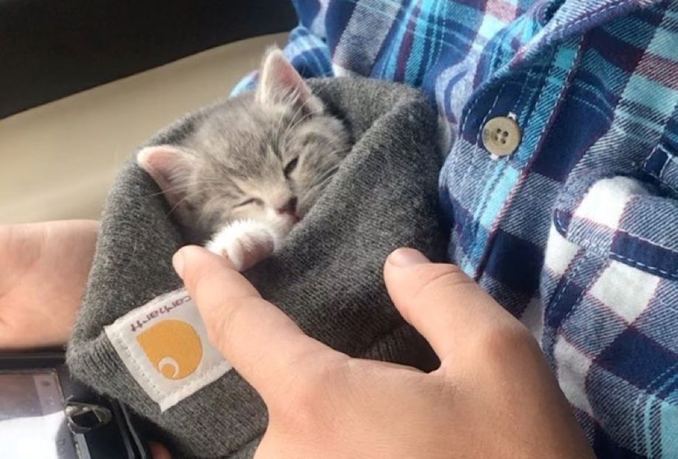 ▼不過這隻小貓非常堅決,不肯離開他們。Claire和Kyle只能帶著牠找媽媽,但他們找到母貓時,母貓根本不願意照顧小貓,反而跑掉了。這麼小的貓咪沒辦法獨自生活,Claire和Kyle就將牠帶回了家。