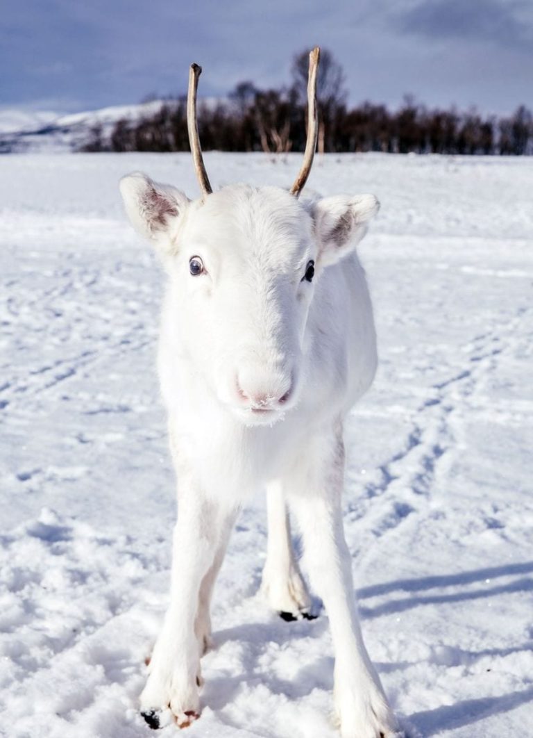 ▼一些網友猜測馴鹿的皮毛是白色的,可能是白化的結果,其實並非如此;由於通常白化個體的眼睛應該會是紅色的,這隻小鹿應該屬於一種比較罕見的基因演化,影響了小鹿體內的色素,才會呈現白色。