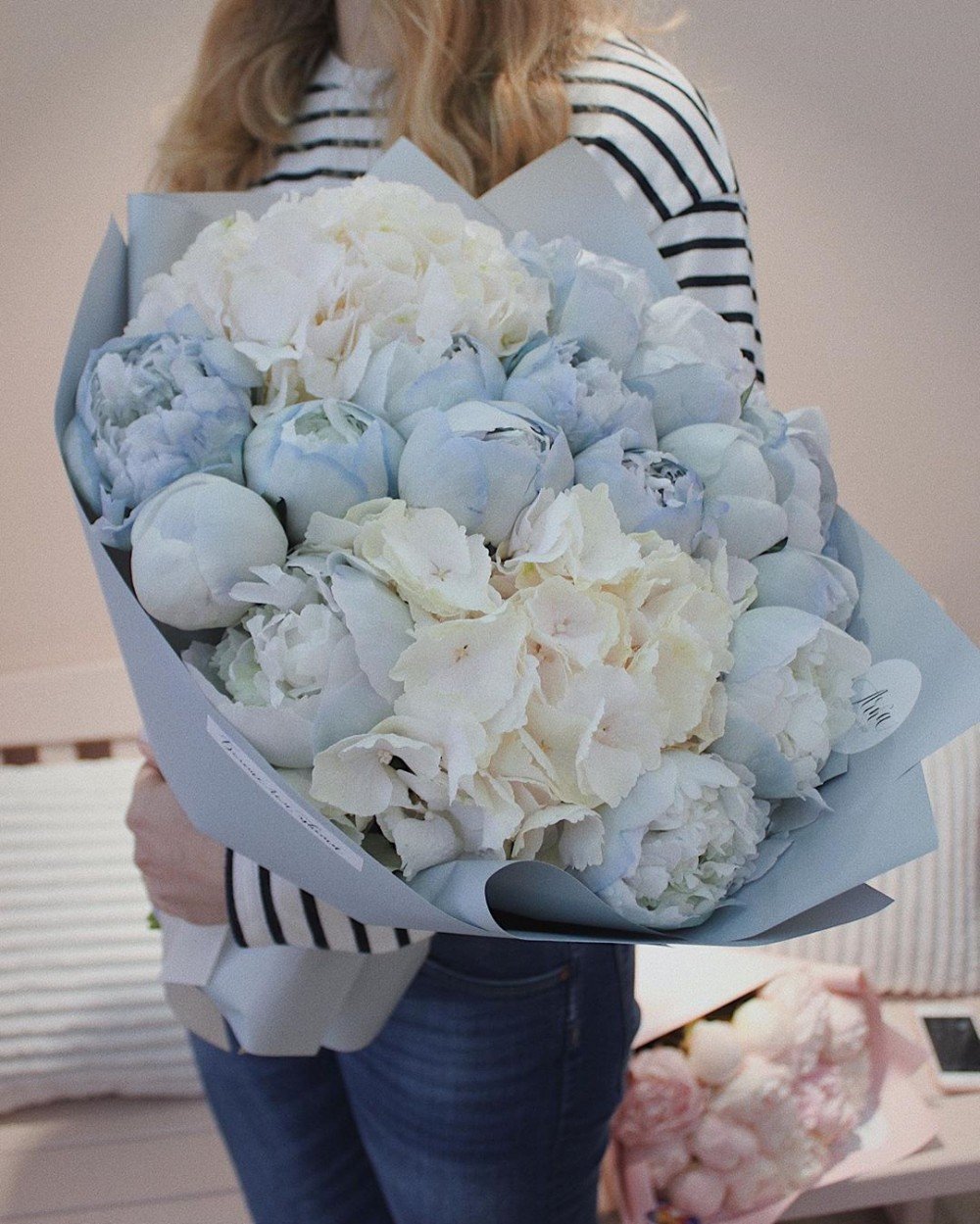現在除了白色、粉色的波波芍藥花,還出現了紫藍色的芍藥花。各位男生,快買一束送給女友吧~