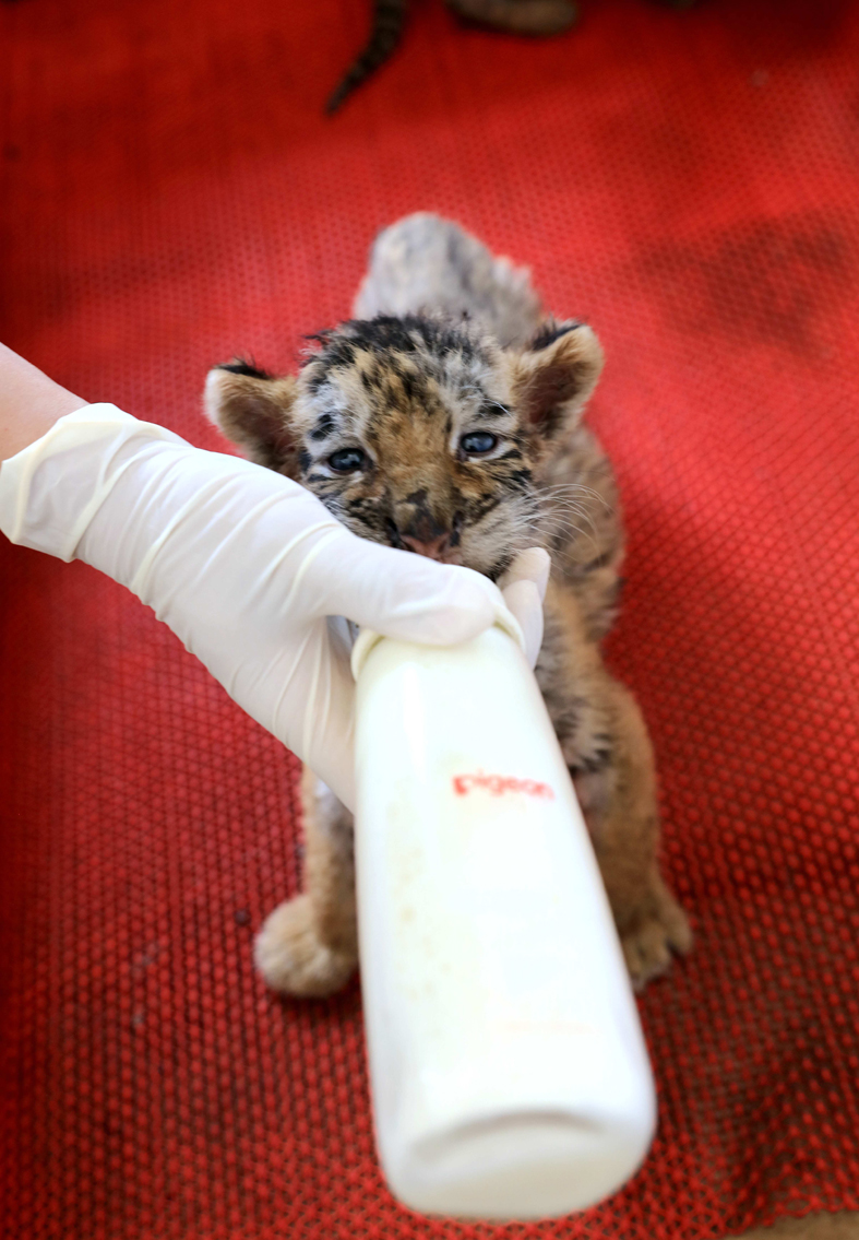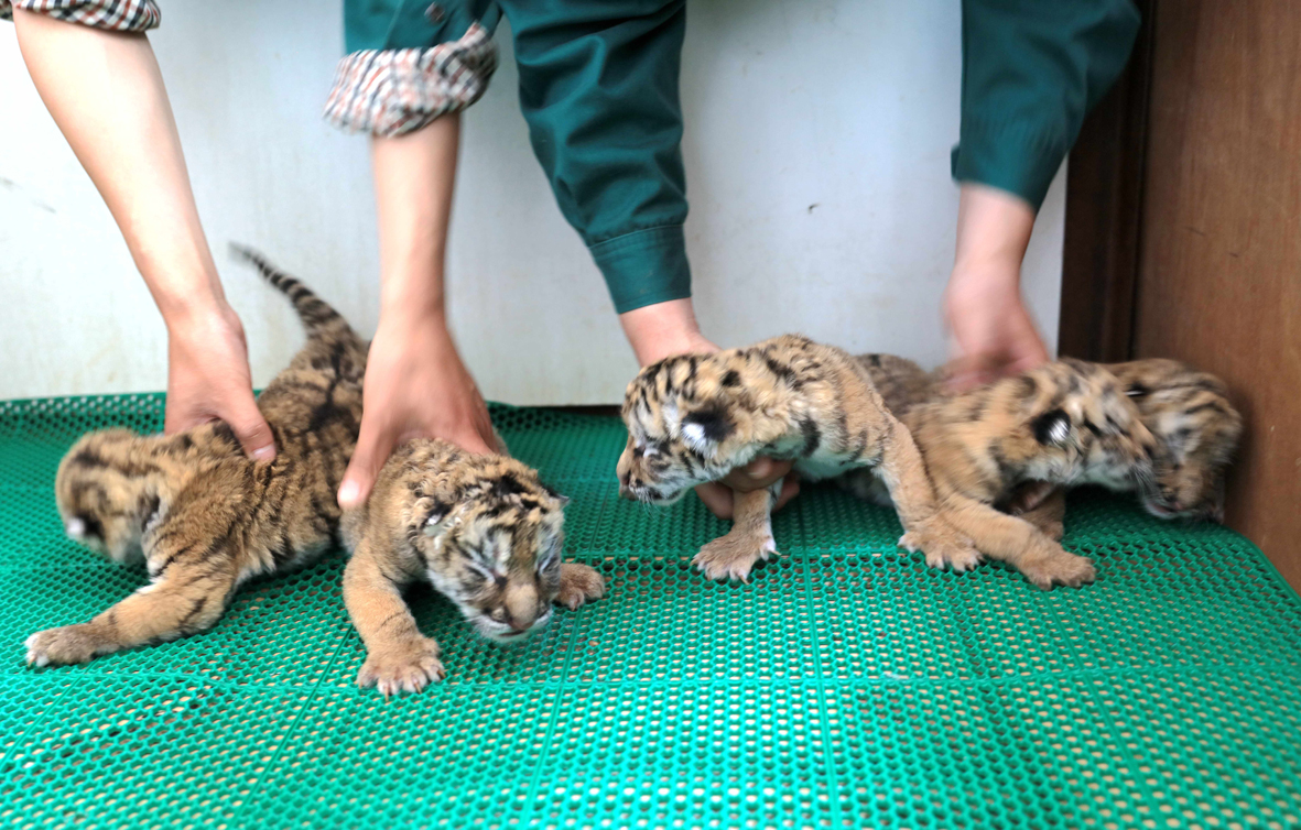 ▼在這50多隻虎寶寶中,有一窩罕見的五胞胎。飼養員細心照顧這些可愛的虎寶寶,每天給牠們餵奶、量體溫、量體重,觀察牠們的一舉一動。這簡直是世界上最棒的工作了!