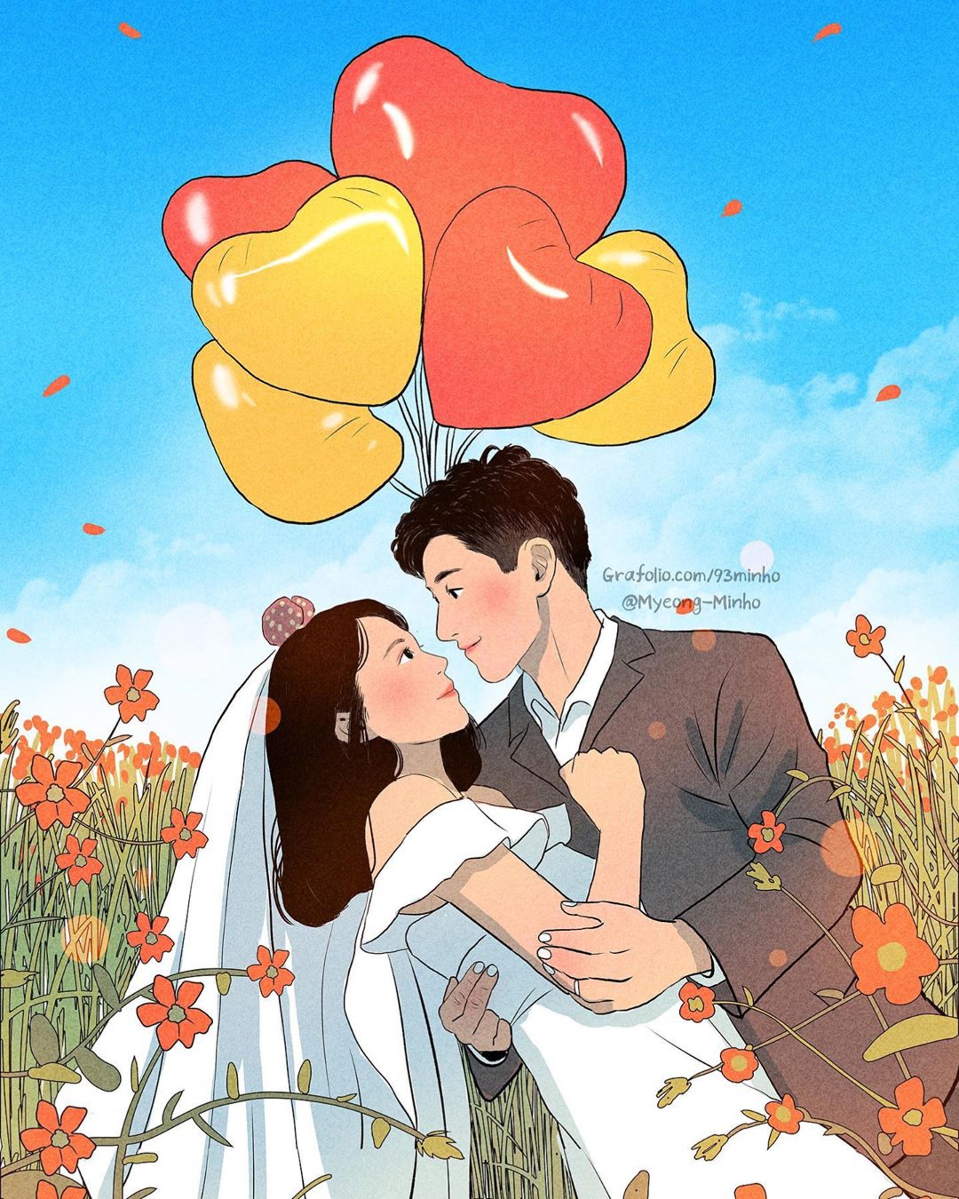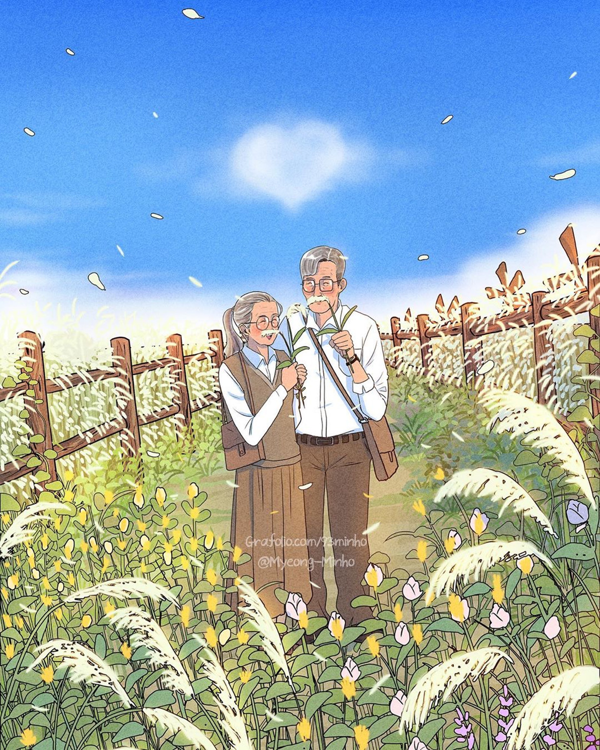 這位插畫家的作品非常療癒,情侶之間的甜蜜互動、夫妻之間的相濡以沫、老年情侶的白首之約,都讓人覺得非常浪漫。兩個人攜手走過漫長歲月,互相陪伴的愛情更讓人嚮往!