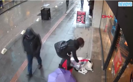 ▼女子覺得狗狗很可憐,她想了一下,解下自己的圍巾披到狗狗身上,然後悄然離去。她本以為這件事沒人看到,沒想到監視器把她的善舉拍了下來。