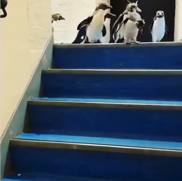 2020年06月21日企鵝走起路來搖搖晃晃的,非常可愛,牠們下樓梯的樣子更有趣!最近南非開普敦的兩洋水族館(Two Oceans Aquarium)出現了萌萌的一幕。工作人員帶領一群企鵝轉移到另一區域時要經過一段樓梯,企鵝們蹦蹦跳跳下樓梯的樣子太療癒了。