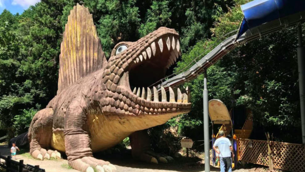 ▼大阪高取山公園:公園內有一座10公尺高的巨型龍雕像,連接著200公尺長的溜滑梯。小朋友會直接滑進龍的嘴巴裡,還能看到尖銳的牙齒。