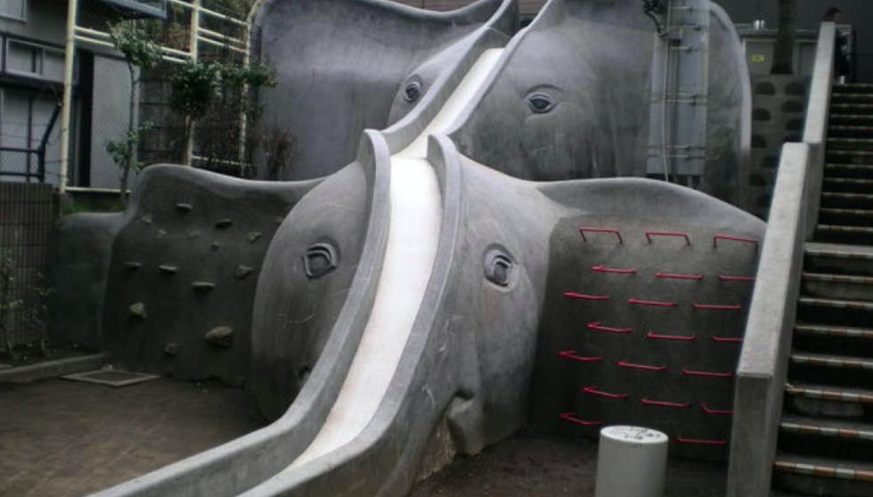 ▼新宿赤城公園:這兩隻大象疊羅漢,將長鼻子連接起來變成溜滑梯。不過大象的外觀徹底走形,而且眼神也很可怕。