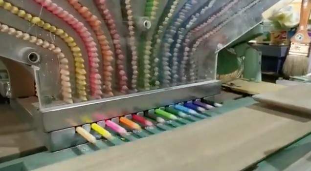 ▼這位推主分享的是色鉛筆品牌Colleen Pencil的生產過程。工廠用12色的大型模具將鉛筆放置在特定的位置,各色鉛筆排開,顯得井然有序。