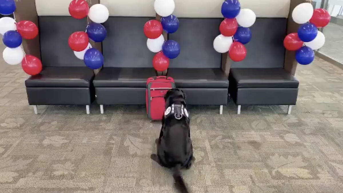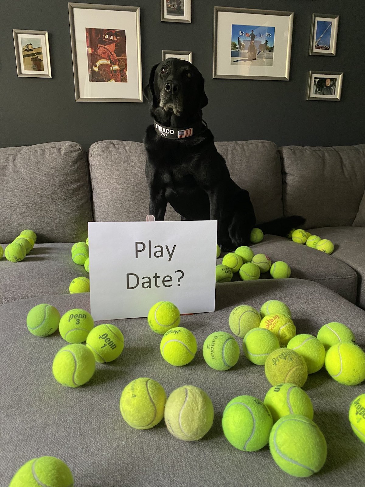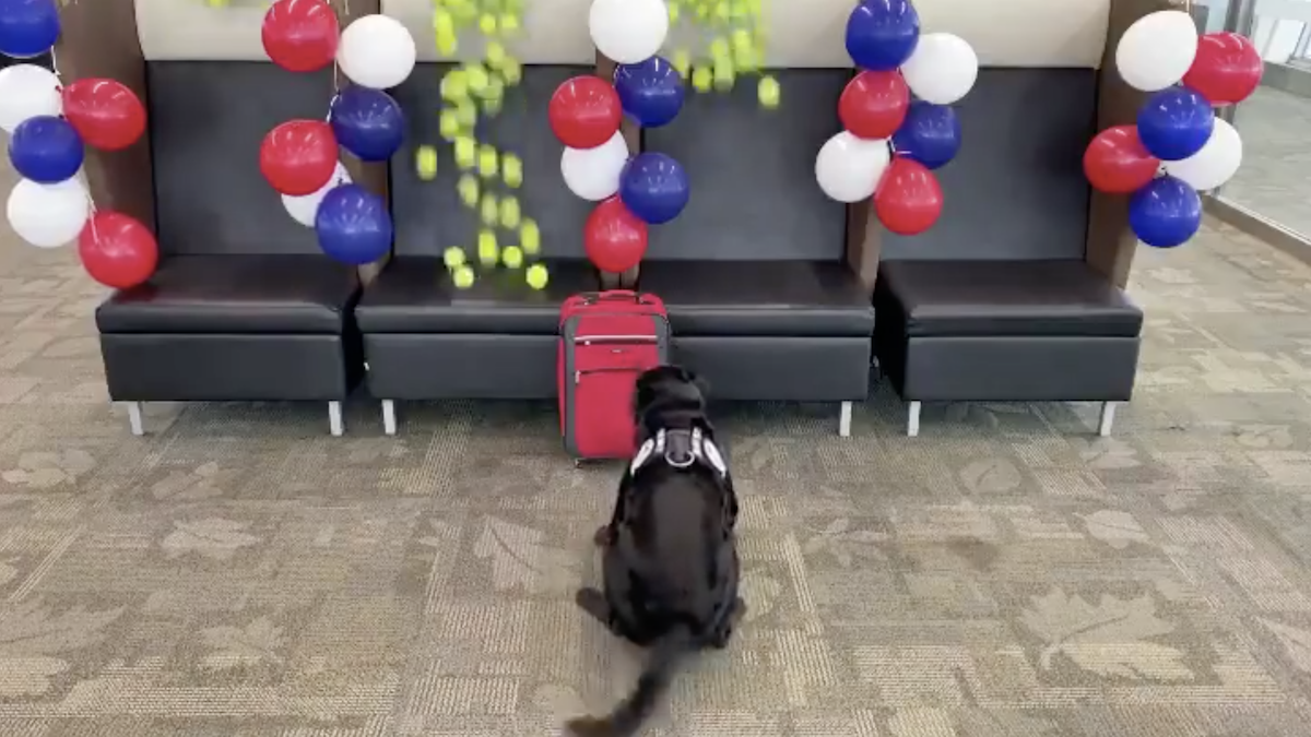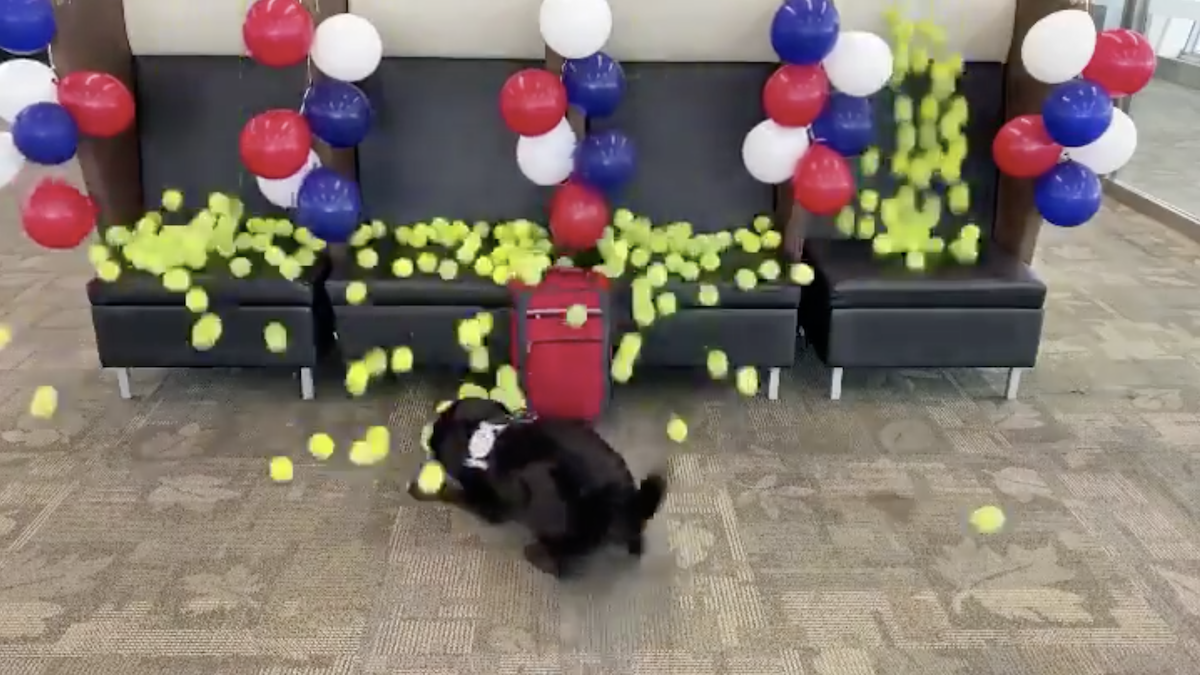 2020年06月20日在服務了8年後,美國這隻偵察犬TTirado終於可以光榮退休了,而在退休之前,還有一份最後的工作要交給牠,只見牠衝到一個紅色包包前嗅了嗅後,坐了下來,突然一陣驚喜的「網球雨」從天上降了下來!