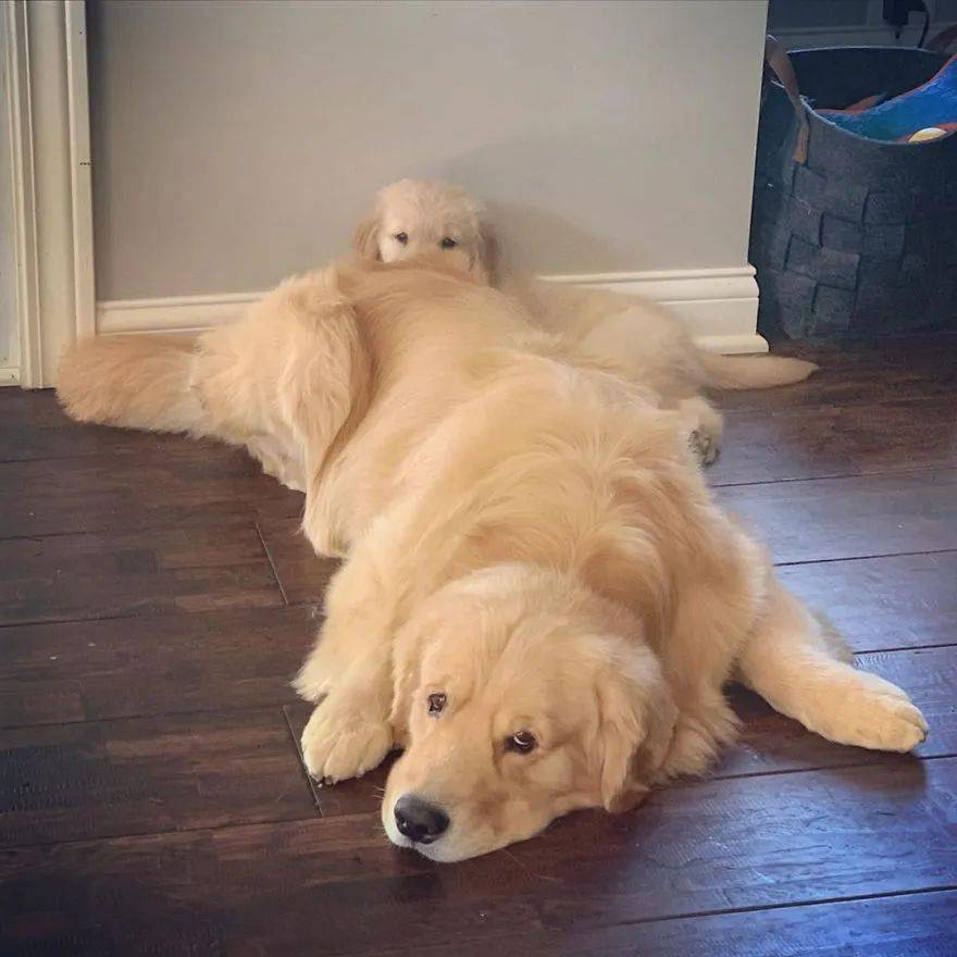 ▼Riggs剛來新家沒幾天,也學會了這一招,躺下後要把哥哥們當成枕頭用。面對愛撒嬌的妹妹,Bodie雖然很不情願,但只能忍耐啦。