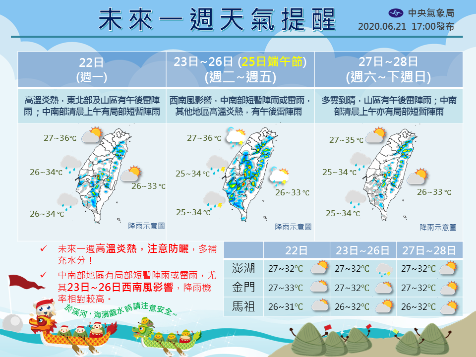 2020年06月23日最近的天氣相當炎熱,各地要做好防曬措施,慎防高溫造成中暑或熱衰竭。根據中央氣象局報導,從週二至週五(6月23日至26日)因為西南風帶來的水氣增加,會造成中南部地區的水氣增加,會有不定時降雨機率,全台則需留意午後雷陣雨。