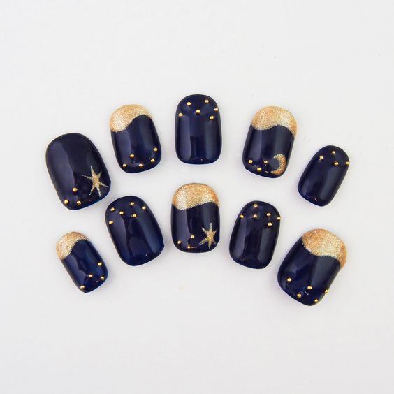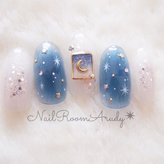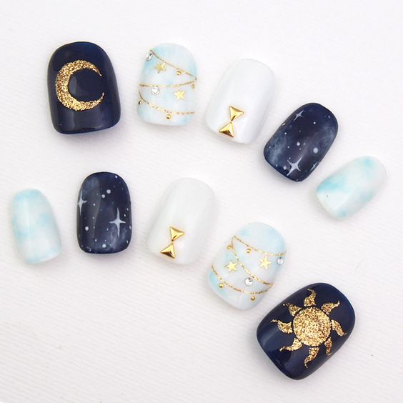 ▼白色、深藍色和粉藍色的搭配,看起來神秘又精緻。白+藍非常清新,再加上金線和金粉造就的星星,就像銀河星空一樣閃耀。