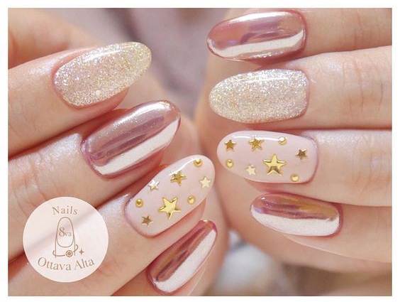 ▼星空美甲一般是藍色系,但粉紅色加上閃粉也很有質感。甜美的女生應該很愛這一款吧。