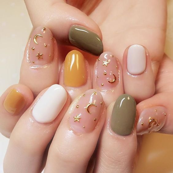 ▼如今極簡主義盛行,很多女孩的美甲圖案也開始走簡潔風。透明指甲搭配金色的星空圖案,清新又俐落。