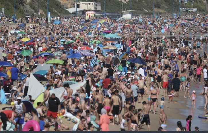 2020年06月27日英國熱浪來襲,很多人顧不上保持社交距離,去海灘避暑。伯恩茅斯(Bournemouth)多塞特海灘上,放眼望去非常擁擠,全是人潮,足足有50萬人。當地議會擔心出現公共衛生危機,連忙宣布「重大事件」。