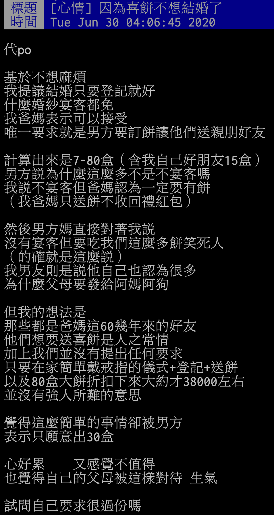 ▼加上自己並沒有對男方提出過多要求,只要在家簡單戴戒指儀式、登記和送餅而已,況且這80盒餅錢花費約才3.8萬元左右,卻被男方反駁只願出30盒,讓她覺得心好累,想問網友「自己要求很過份嗎」。貼文一出造成網友的議論,有許多網友認為是婆家小氣,這樣要求並不過分;但也有網友認為,因為沒有宴客所以男方收不到禮金,可以提問看看若是宴客的話,男方是不是就可以接受了。