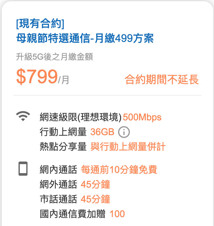 ▼根據中華電信官網,現在使用的是「母親節特選通信-月繳499方案」的合約用戶們,可以改成每月繳「799元」的5G服務方案。升級5G後網速級限可以來到500Mbps,但是轉換後行動上網量變成只有36GB,不再享有「吃到飽」的服務,屆時用戶可能就不能太「隨心所欲」的上網了。