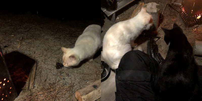 ▼隔天早上推主醒來,堆放生火木材的地方竟然多出了一小堆毬果,原本以為應該是貓咪們為了感謝自己的招待而特地送來的禮物,但到了第二天晚上,卻發現貓咪們看到營火火勢變弱的時候,默默地將毬果推了過去…