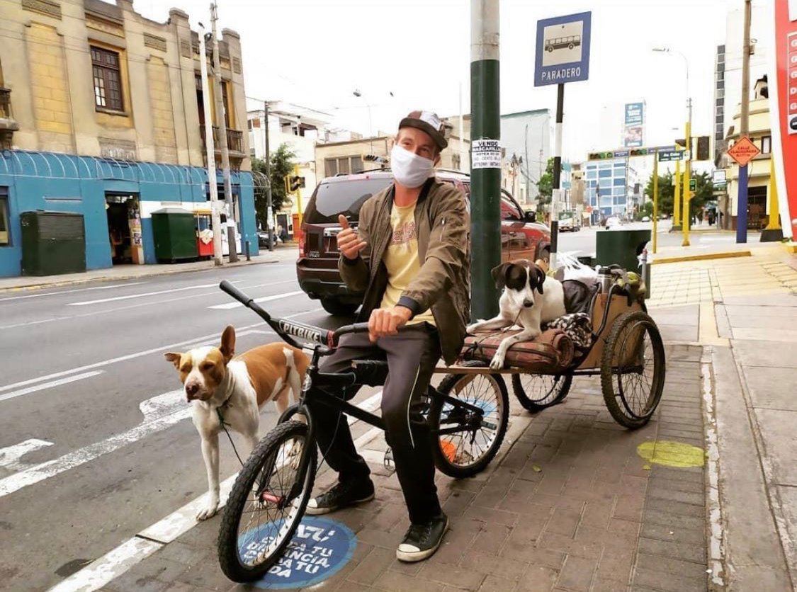 2020年07月08日這位來自阿根廷的33歲男子名叫格雷夫(Michael Graef),在秘魯旅遊時,剛好遇到COVID-19蔓延,當地宣佈緊急封鎖令,有許多航班被迫暫停,他因為不願拋下自己路途中收養的兩隻狗狗,花了40天的時間,騎乘一輛自行車改裝三輪車,靠雙腳將狗狗一起載到秘魯首都利馬。