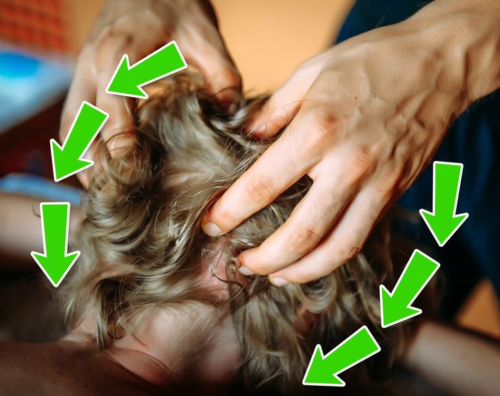 ▼3.頭部按摩:從頭頂一路按到肩頸,用手指梳理頭髮;抓住兩側的頭髮,從髮根開始輕輕纏繞到髮尾;將一隻手放在頭頂,另一隻手撫摸頭髮,並輕輕按壓頭部和後頸;用手指撫摸兩側頭皮,從前向後按摩,直到手指交叉。按摩頭部能夠減輕壓力。
