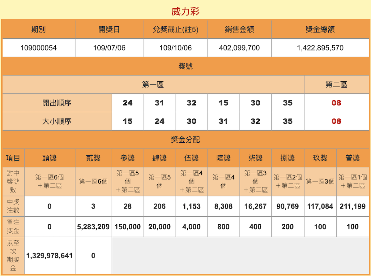 ▼威力彩第109000054期在7月6日晚間開獎,開出號碼分別由小到大依序為15、24、30、31、32、35,第二區的獎號為08。根據台彩網站顯示,這期雖然仍是沒有人中頭彩,但是貳獎由3位幸運兒一起均分拿走,每注各得新台幣528萬3209元。