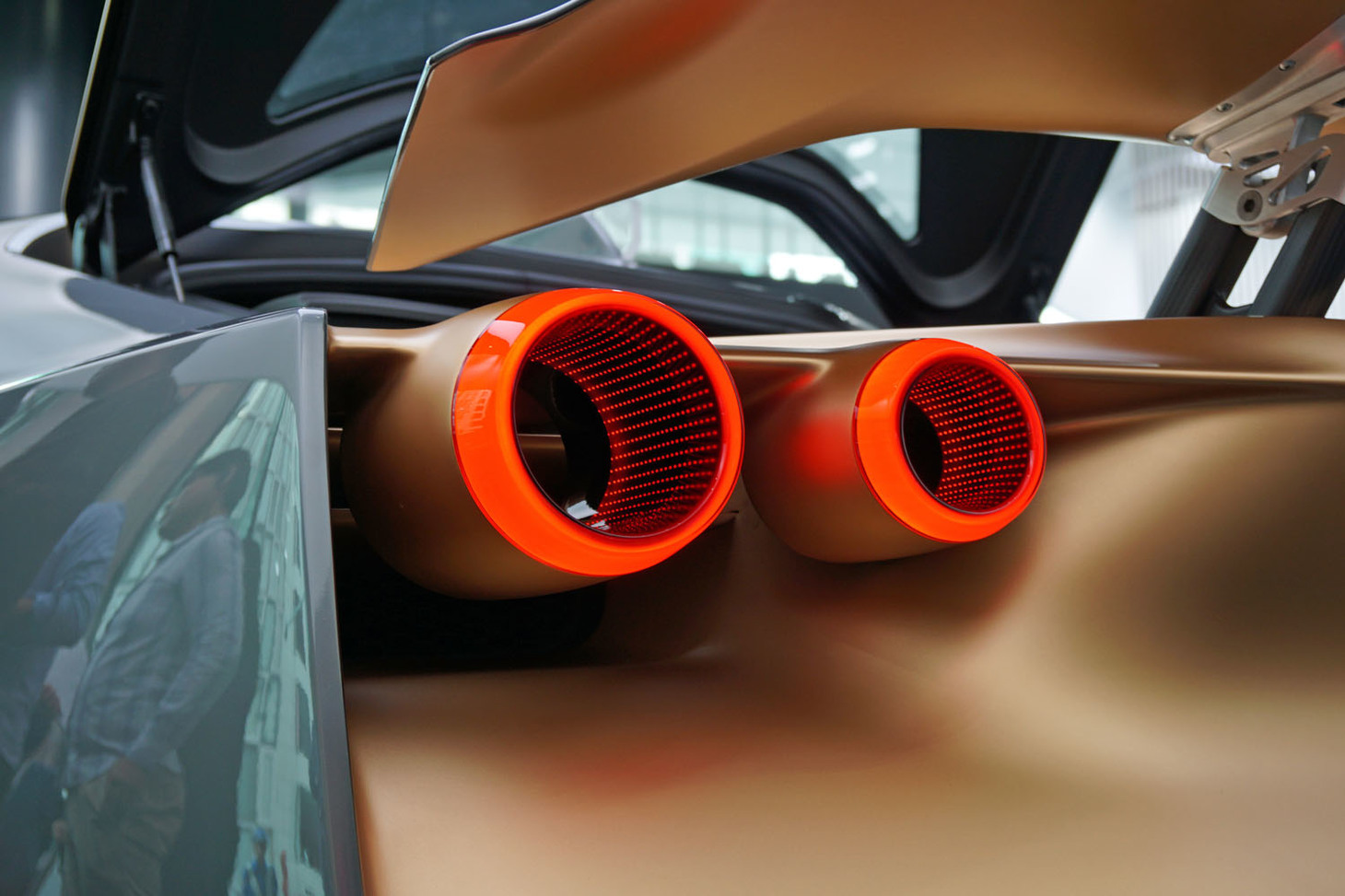 ▼GT-R50的基本樣式有別於一般GT-R,映入眼簾首先就會先被古銅般的金色澤吸引,GT-R的「R」也鑲上金邊營造出強烈特色與奢華質感。延展的頭燈則讓它整體看起來比實際尺寸更寬廣,車高則比原型更矮54毫米,展現出精悍的模樣。設計部門的專案執行專員也說,GT-R50可以說是GT-R系列的究極型態。