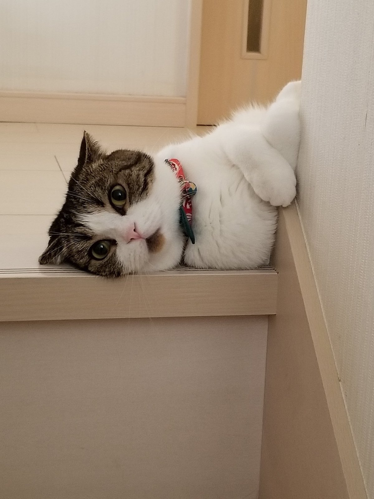 ▼像這位網友的喵咪,仰躺在地板上,做出招牌招財貓咪手的動作,頭微微的抬起,下巴的黑色花紋讓牠像是在對著鏡頭說:「噢!」