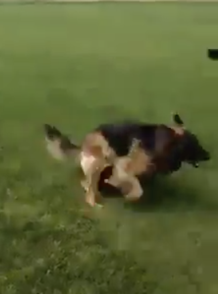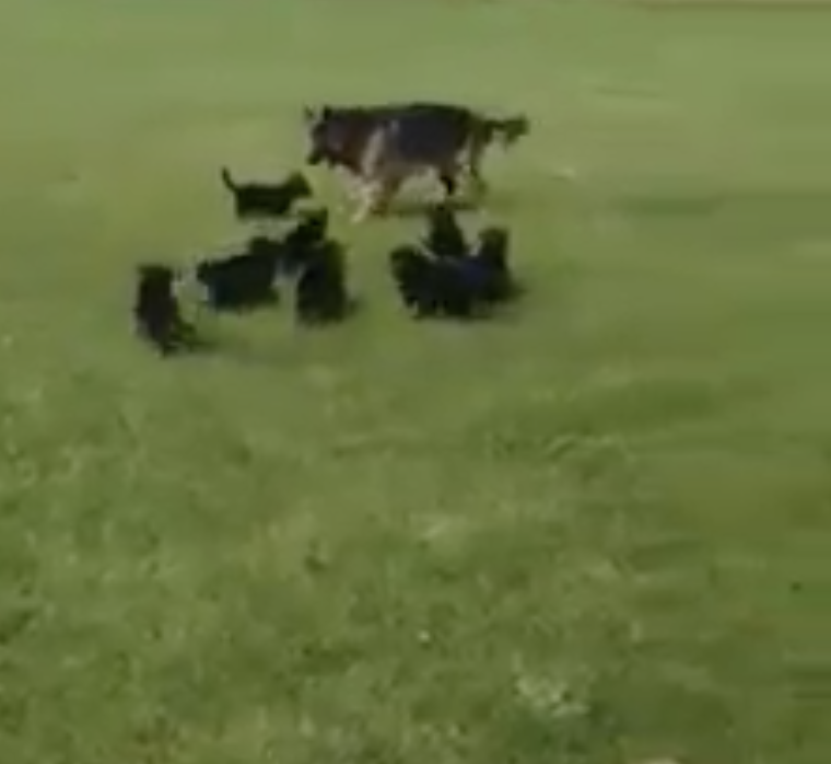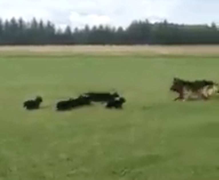 ▼狗媽媽在草地上狂奔,吸引小狗們的注意力,讓牠們來追趕自己。牠不停改變奔跑方向,其實是圍著小狗們繞圈。小狗們左跑右跑,始終追不上媽媽,也不會離開媽媽的奔跑範圍。