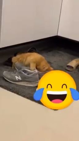 ▼從照片中可以看到,貓咪把頭埋在鞋子裡,吸完一隻鞋子又吸另一隻。牠還在鞋子上不停磨蹭,那畫面看起來很可愛。