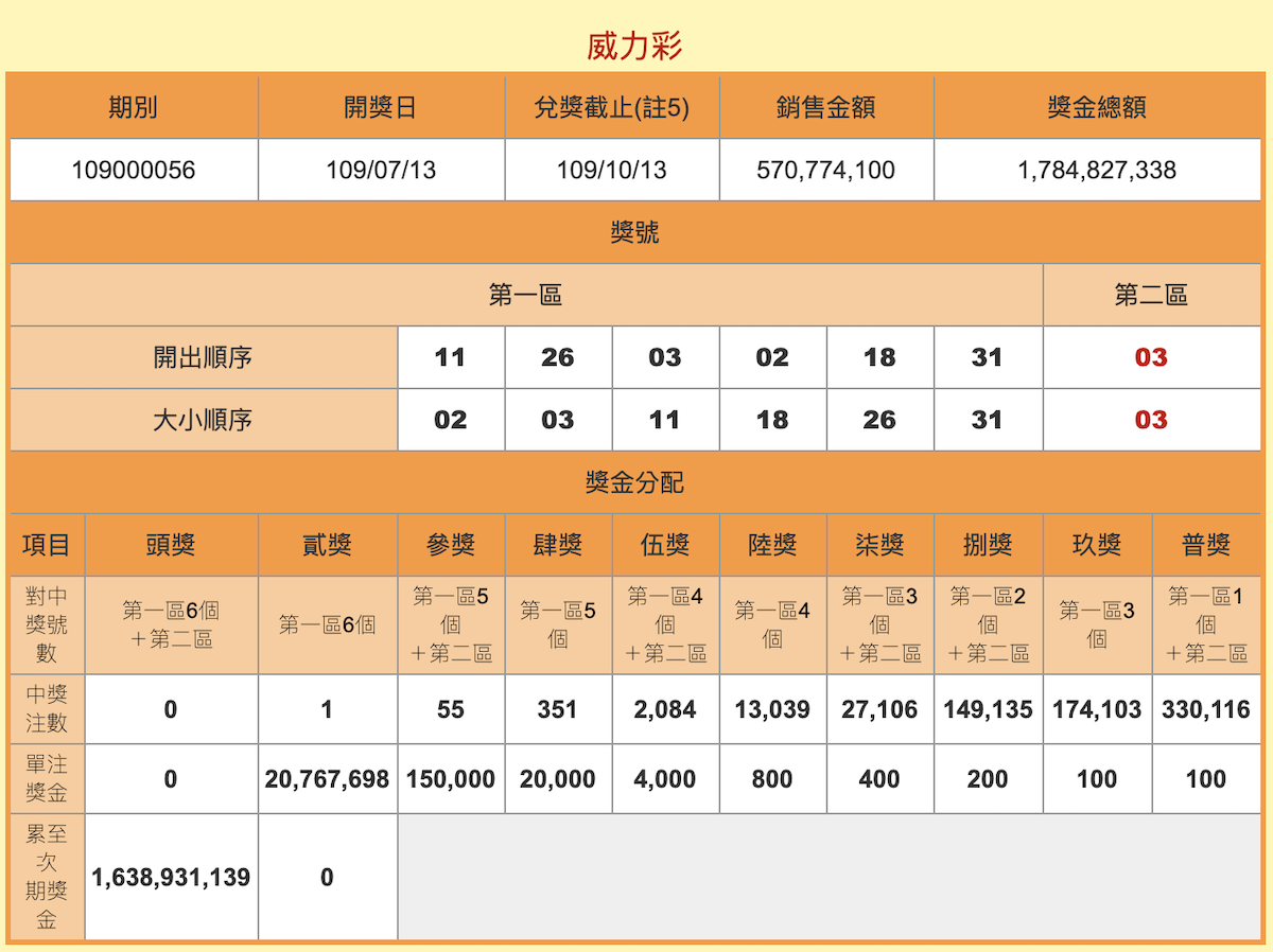▼第109000056期威力彩於7月10日晚間開獎,開出獎號由小到大為02、03、11、18、26、31,第二區號碼為03(號碼以台灣彩券公司公布為準)。這期銷售金額約為新台幣5.7億元,頭獎獎金16.2億元無人中獎,貳獎1注中獎,可抱走約2千多萬元獎金。